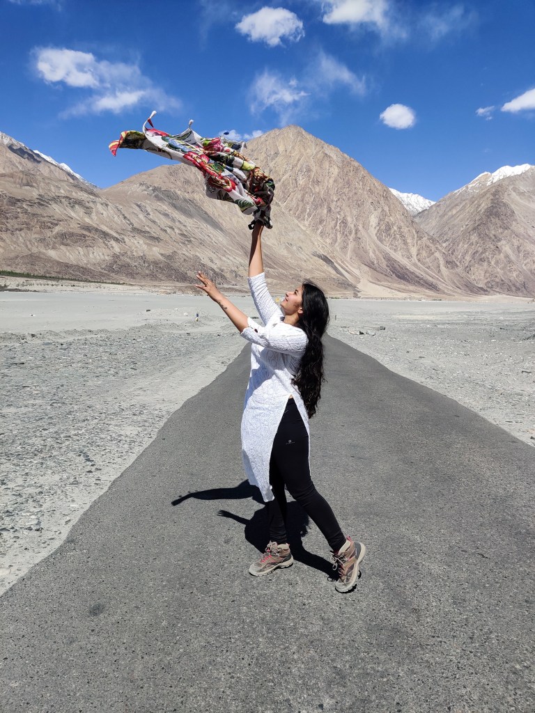 Kurta, scarf, and mandatory boots for a comfortable long daytime journey in Nubra valley