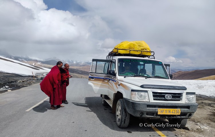 To avoid discomfort, we had booked one front seat and the other on the middle seat. I kept the window open to avoid suffocation. On the way to Pang, we had to go off-roading for a few kilometers, the driver asked me to close the window so I closed it a couple of times but I felt suffocated so I reopened it and forgot to close it. After a few minutes, Ranjan tapped on my shoulder and asked me to close the window again. When I turned back, the middle and back seats were filled with a lot of dust! No one said anything but their facial expressions were enough to convey the discomfort due to dust. Then I looked at the monks, they seems undisturbed radiating positive energy with a slight smile on their faces. I apologized, closed the window, and went into a loop of thoughts!