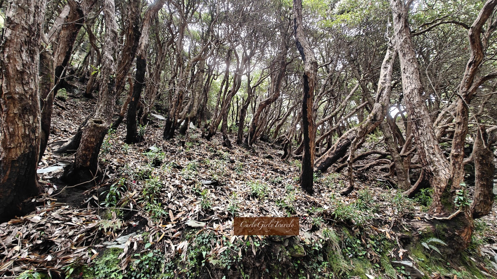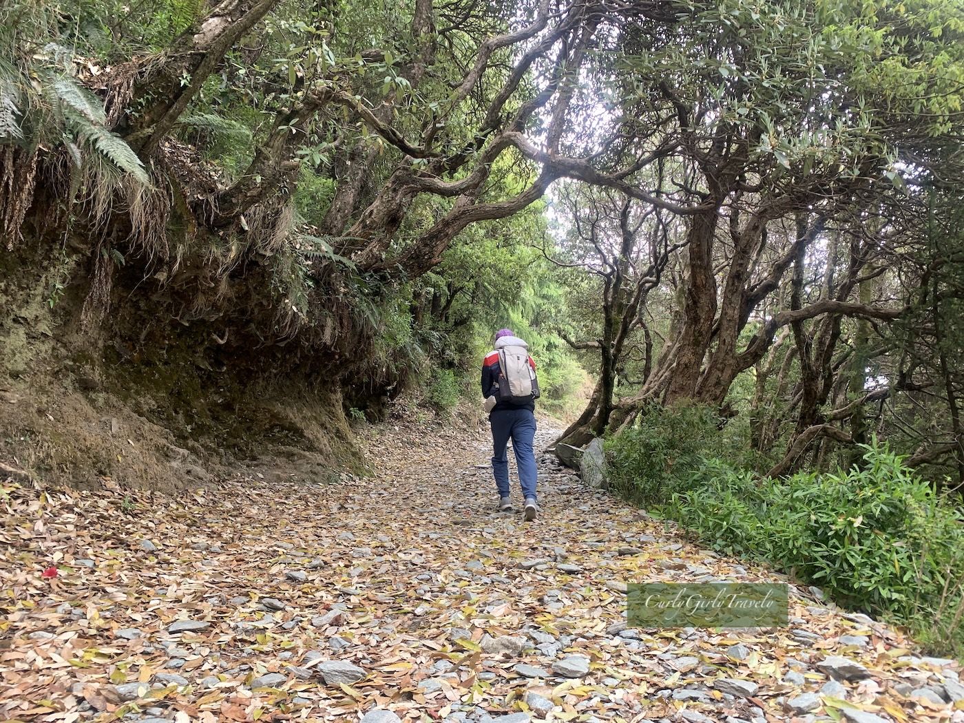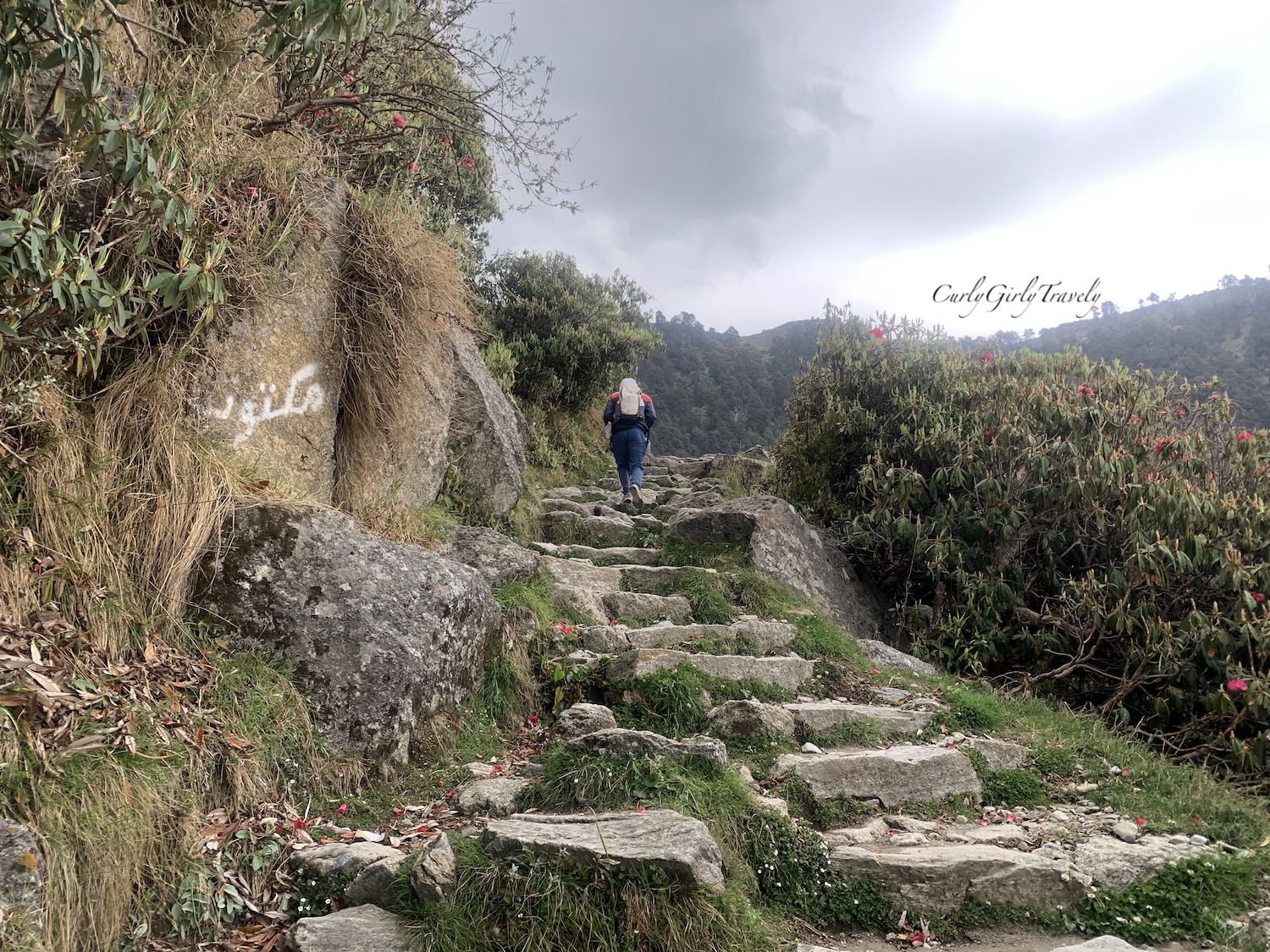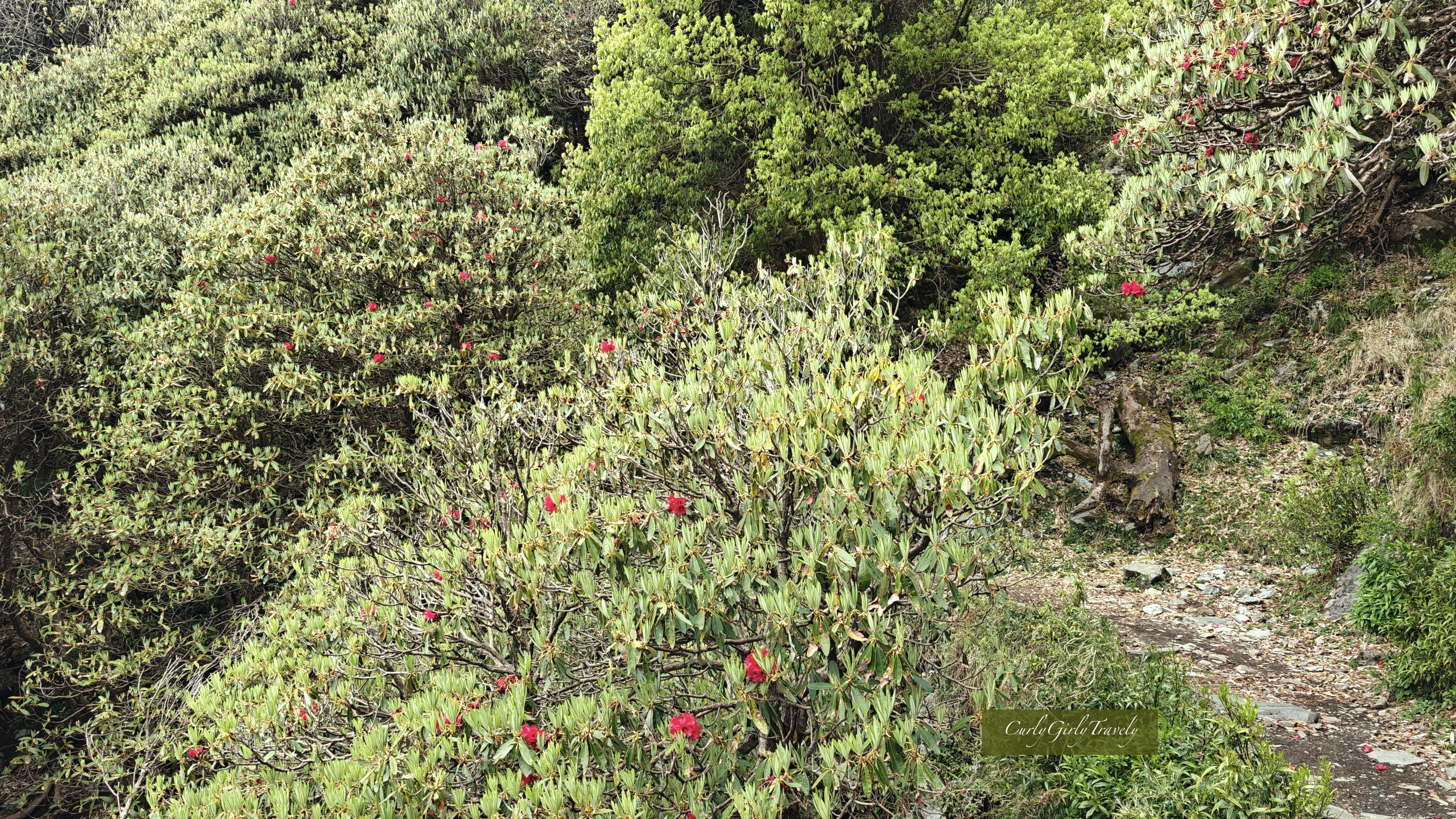 The trail was filled with dried yellow leaves and pebbles, surrounded by trees with bright red rhododendron flowers. It’s intense red petals dazzled the eye making hard to capture them in photos. The first half of the trek was completed while admiring the beauty of nature and engaging in random conversations.