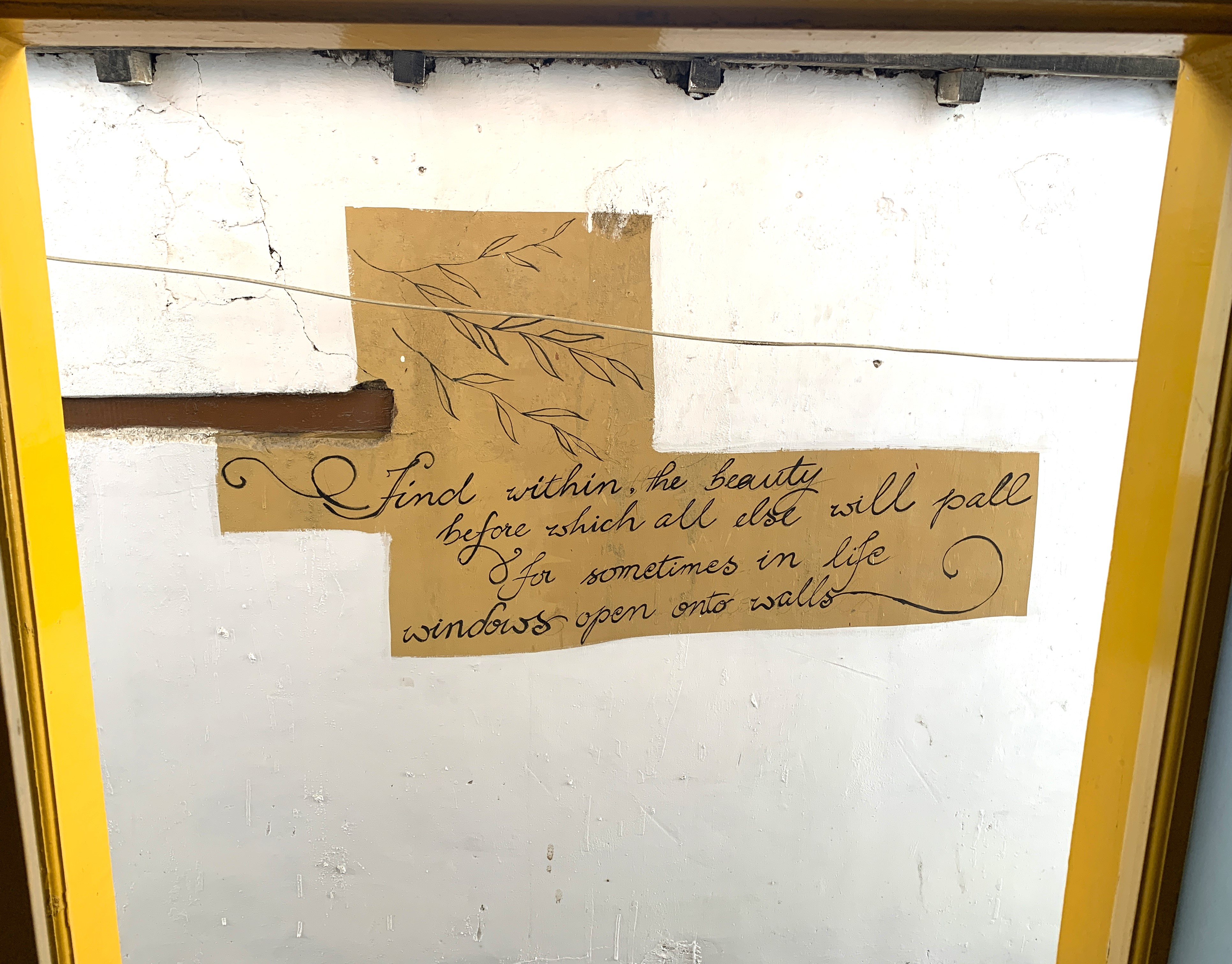 The drink was a local concoction—a delightful blend of apples, cinnamon, and a touch of something magical. As I sipped it, I began to take in the room’s details. The space was adorned with beautiful handicrafts, each telling its own story. Ranjan opened the window for some fresh air and was immediately struck by the quirky wall design outside.